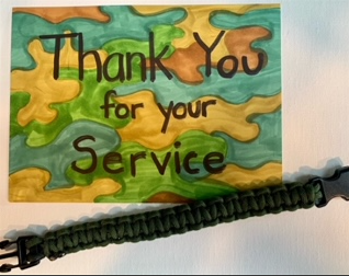 Create a paracord bracelet that meets military specifications for our soldiers, along with a camouflage-inspired thank you card. Presented by Green Earth Crafts. (1 hour credit)